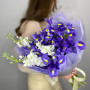 Букет из синих ириcов и белой кустовой розы